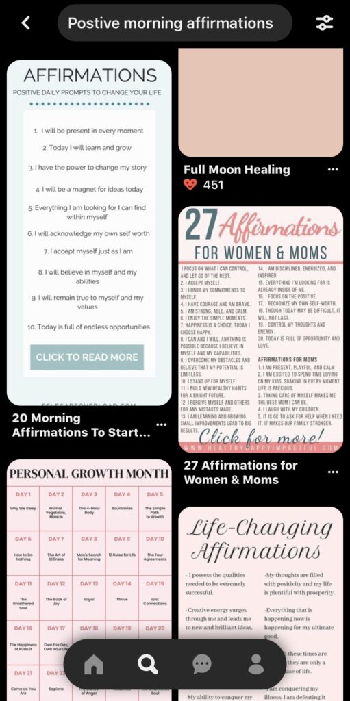 Now under this search there are endless affirmations you can repeat to yourself to start your day in the right direction. Another idea is to hop out of bed, look in the mirror and tell yourself positive things and what you love about yourself and the great things you are going to accomplish that day.